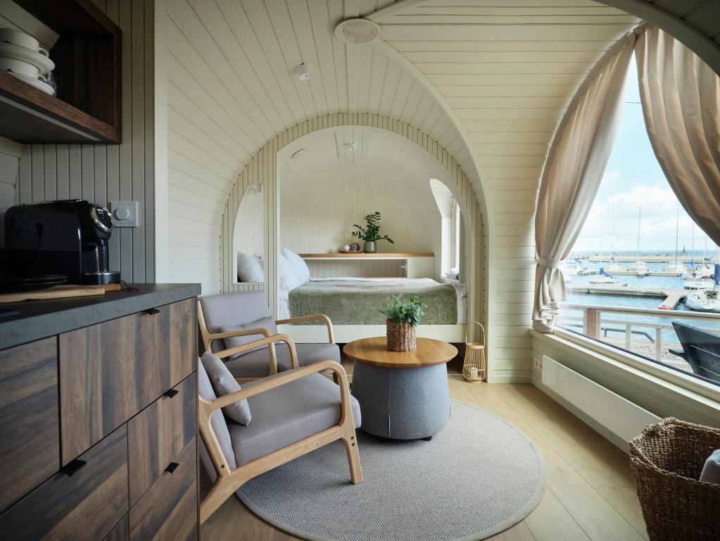 Die Hütten sind kompakt und dennoch gemütlich. Sie verfügen über große Fenster mit Blick auf den Tallinner Golf und private Terrassen, die sich perfekt für ruhige Morgenstunden oder einen Drink bei Sonnenuntergang eignen. Mit nur neun Zimmern bietet der Iglupark einen intimen Aufenthalt, der Entspannung und Kreativität fördert.